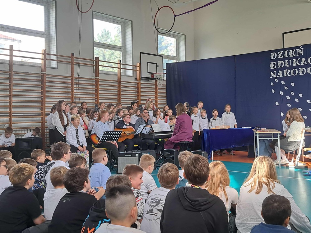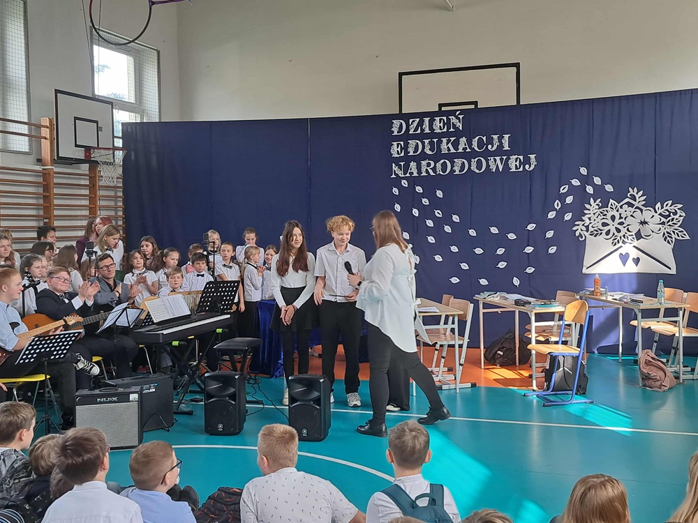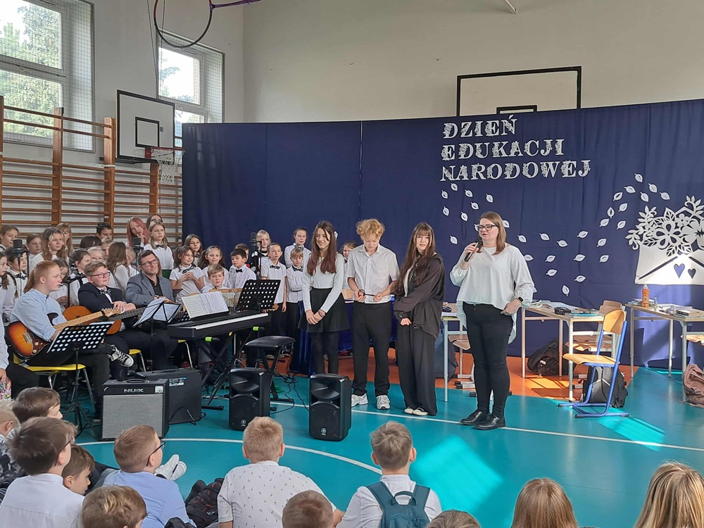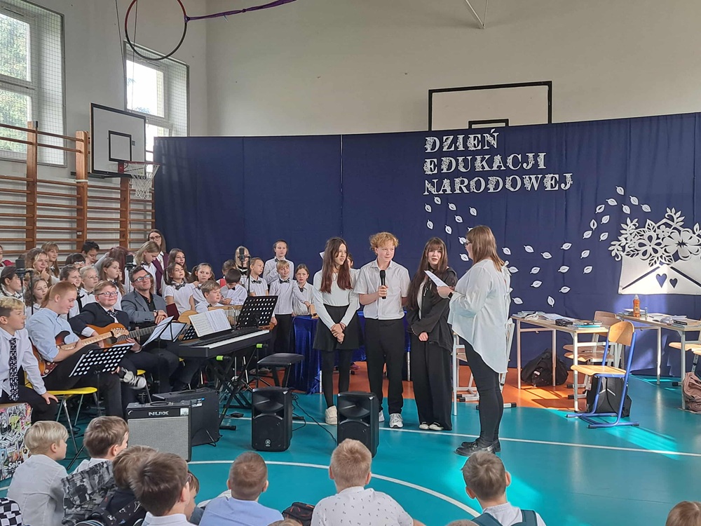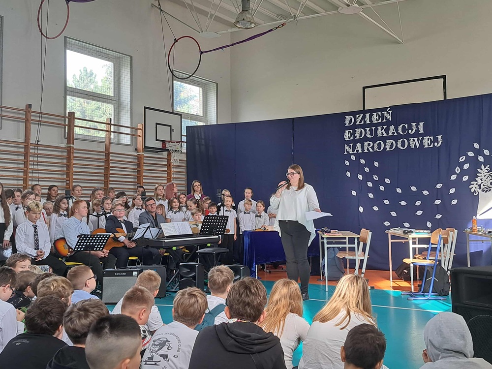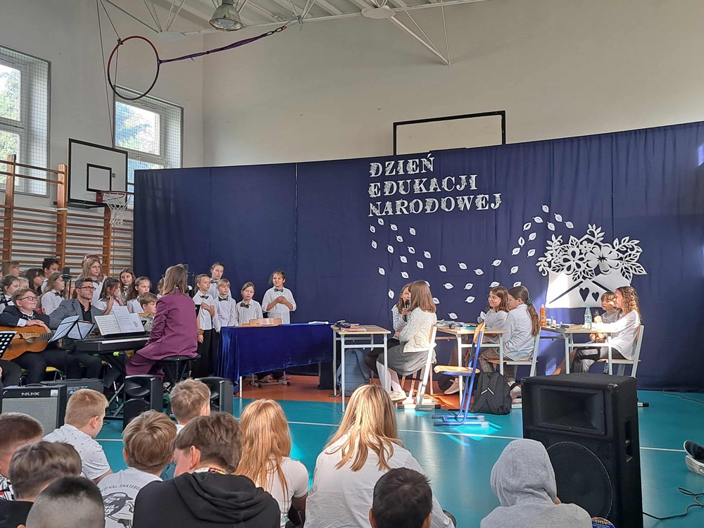 W poniedziałek, 13 października br., odbyła się uroczystość z okazji DEN. Wzięli w niej udział Nauczyciele, Dyrekcja, Pracownicy oraz Uczniowie naszej szkoły. Zgromadzonym w sali gimnastycznej gościom zaprezentowano przedstawienie pt. “Dzień Nauczyciela”, które przygotowali uczniowie klas: 4A, 5A i 5B, pod kierunkiem p. Agnieszki Dąbrowskiej i p. Moniki Waligórskiej-Ucig. Oprawę muzyczną tradycyjnie opracowała p. Monika Chęć wraz z chórem szkolnym.