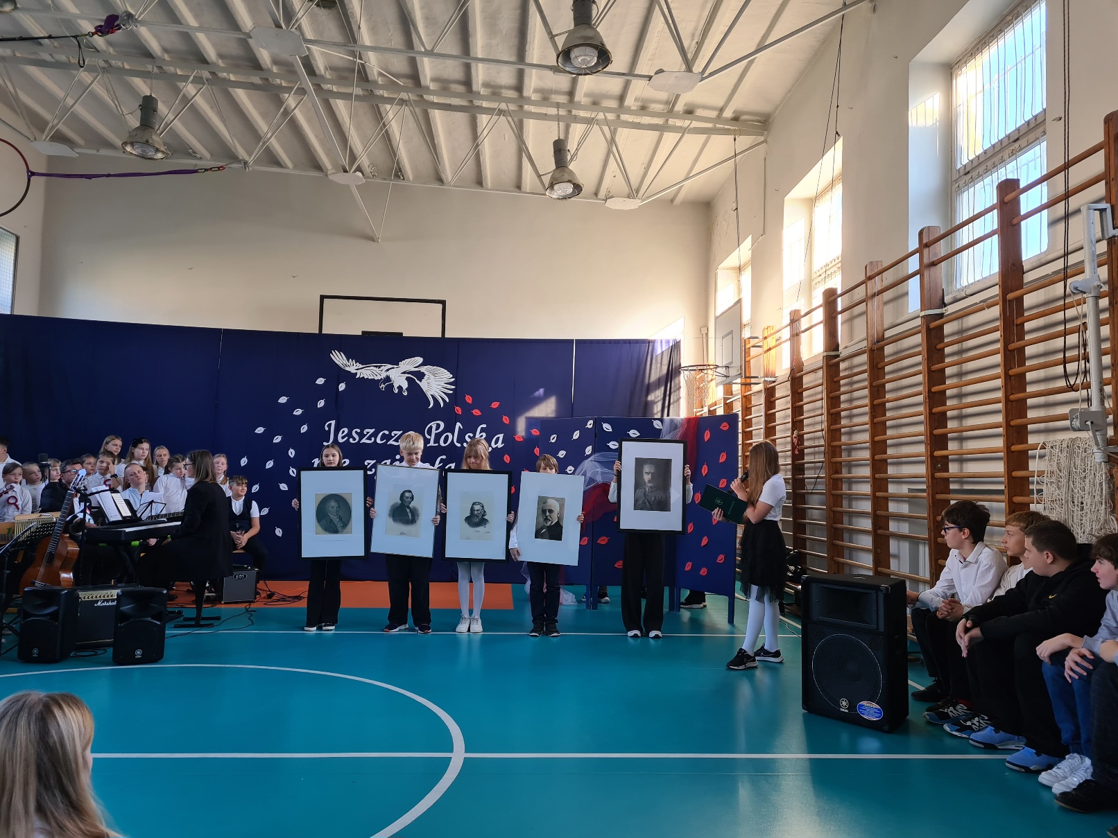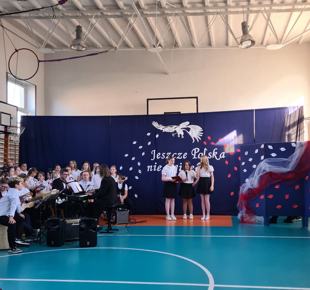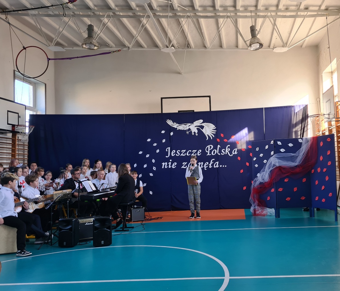 Szkoła wzięła udział w akcji „Szkoła do hymnu”, tym samym rozpoczynając akademię. Następnie uczniowie zaprezentowali program artystyczny, w którym można było usłyszeć recytację wierszy patriotycznych, które w piękny i wzruszający sposób wyrażały miłość do Ojczyzny oraz pieśni patriotyczne w wykonaniu szkolnego chóru „Marsz Pierwszej Brygady”, „Rozkwitały pąki białych róż”, „Wojenko, wojenko” czy „Szara piechota”, które wprowadziło wszystkich w podniosły, refleksyjny nastrój. Uroczystość przygotowali wychowawcy i uczniowie klas V oraz opiekun chóru szkolnego. Piękna scenografia, biało-czerwone dekoracje i symbole narodowe przypominały nam jak ważne są wartości, które łączą nas, jako Polaków.
